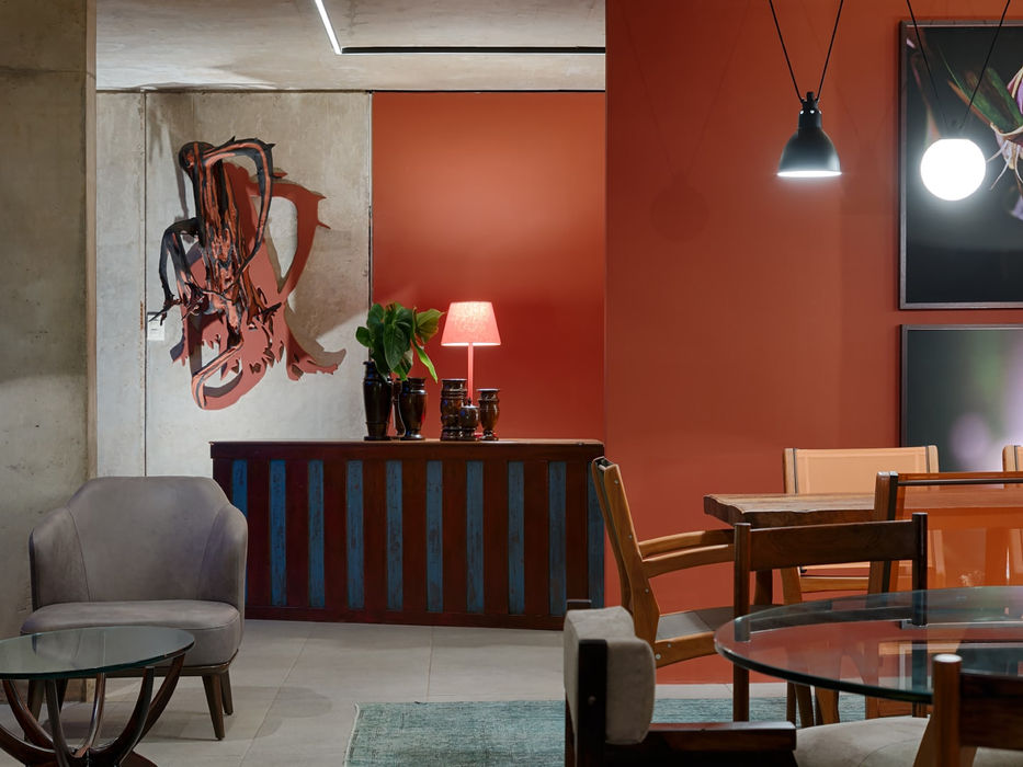 Quanto mais caminhamos para a tecnologia, mais nossa alma vai em busca de quem somos. Encontrar o ponto de equilíbrio é a receita para estarmos em casa. A cor escolhida para o restaurante foi a terra vermelha. Ao longo do espaço, uma exposição com peças de Amilcar de Castro, Ascânio MMM e Frans Krajberg para contar a histaória da escultura brasileira. A poltrona Vronka de Sérgio Rodrigues dialoga com as poltronas de Jorge Zalszupin e com as mesas de Percival Lafer. Trazendo frescor e jovialidade ao ambiente, as fotografias de Paula Huven retratam pedaços de cotidiano na exposição «Dias Comuns».