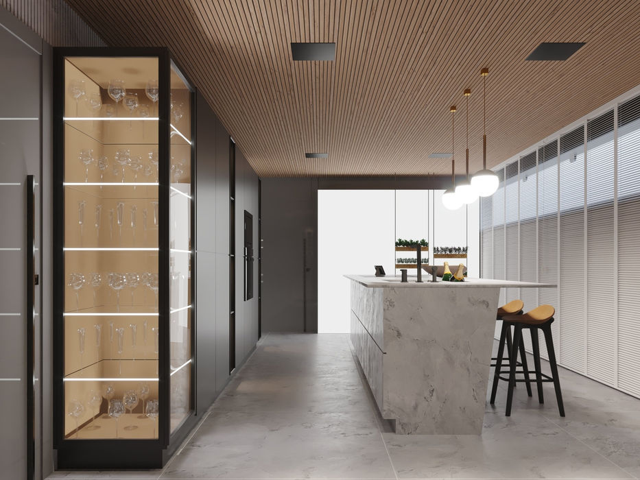 O design exclusivo da marcenaria dos espaços permite embutir fornos, coifa, cooktop e refrigeradores. Outra grande vantagem dos ambientes é a automação: com um touch-panel à mão, basta escolher o vinho para que uma luz indicativa acenda o nicho correspondente, a coifa se eleva da bancada, o som permeia o ambiente e as luzes criam um cenário perfeito tanto para aqueles que apreciam cozinhar quanto para aqueles que querem viver bons momentos com os amigos e a família.
