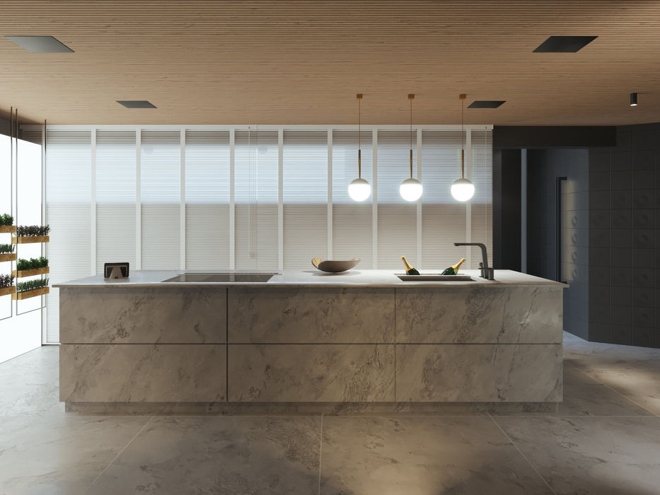 No piso e no desenho escultural da bancada e dos armários está presente o quartzito calacatta, que é um material que apresenta elegância, suavidade e durabilidade. No teto, o ripado aquece e proporciona conforto aos ambientes.
