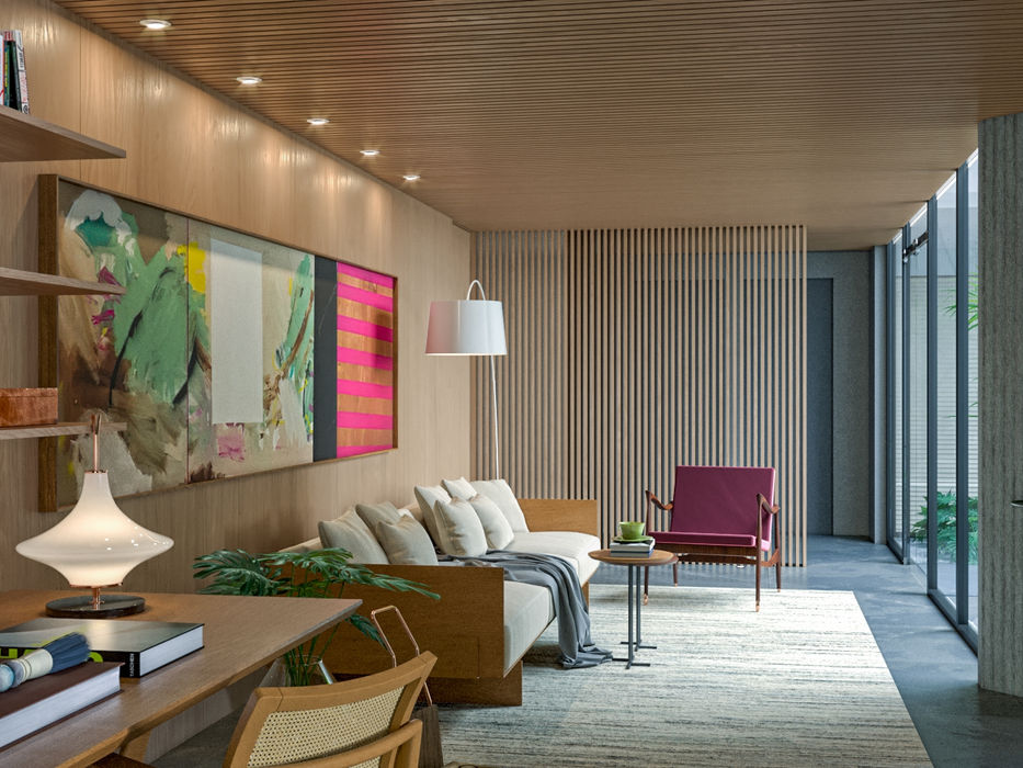 O Hall Integração é um ambiente situado no coração da casa, voltado para um jardim interno muito aconchegante e tem como função principal a conexão entre todos os ambientes da casa. E foi pensando nesta função da confluência que o projeto foi desenvolvido, com o objetivo de propiciar um local de encontro, de bate papo, de leitura, de ouvir uma música, apreciar a natureza, enfim um pouso na Casa Pouso. Com sua forma longilínea proporcionou a ambientação de uma área de conversação e uma área de trabalho, tão necessária nos dias de hoje na vida de todos nós.
