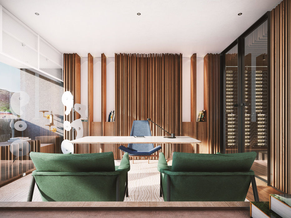 A narrativa começa a ser construída com a imponência da madeira e a riqueza das texturas do tapete e do mobiliário. A tela do artista Pedro Bolina se encarregou do toque de cor e descontração, e luminária de piso Foscarini Orbital equilibra trazendo sofisticação e modernidade. A adega é um convite a celebração, a concretização de negociações e projetos.