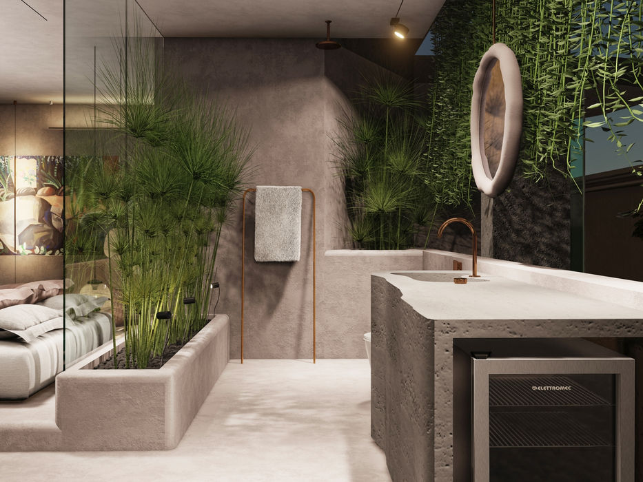 A total integração com a área externa e a presença de muita vegetação trazem o frescor para o uso de longas horas do quarto e o seu universo particular.
