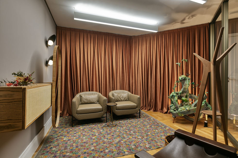 Para a criação do ambiente, peças clássicas do modernismo assinadas pelo eterno Sérgio Rodrigues se misturam a traços contemporâneos e linhas elegantes de designers brasileiros como André Ferri, Maurício Bonfim e Ronald Sasson. Esse mix interessante traz uma proposta despojada e ao mesmo tempo sofisticada. O espaço foi pensado para acolher, permitir experiências, sentir um aroma, perceber o toque das peças, ver o abraço e ouvir o belo. É essa mistura de sensações que eu espero que as pessoas sintam ao visitálo.