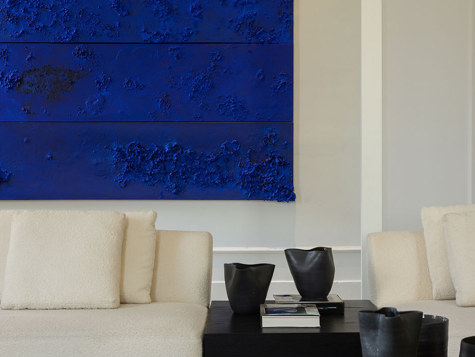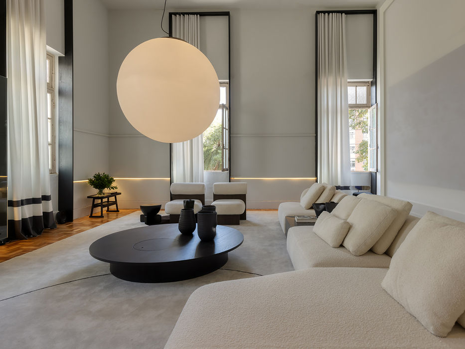 Com a concepção de uma galeria, o ponto de partida para a criação do ambiente foram as obras de arte de Letícia Moretzsohn. Para realçar as cores vibrantes trazidas de pós naturais, optamos por uma sala monocromática com pontos na cor preta. Na entrada, um obstáculo em voil fluido para um impacto visual. Os móveis foram escolhidos em linhas curvas e tons neutros, para não ofuscarem a beleza das telas. O nome Lua vem do pendente que compõe de forma marcante o espaço.
