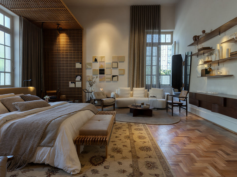 Ao mesclar peças de diferentes épocas e estilos, é possível valorizar tanto a história dos clássicos do design quanto a inovação presente nas criações contemporâneas, acrescentando personalidade ao ambiente. O espaço foi pensado para ir além do descanso, contando também com um ambiente de estar e home office para atender às necessidades do dia a dia, mantendo sempre a atmosfera aconchegante e confortável para todos os usos. Os tons neutros e texturas serão incorporados nos tecidos, tapetes, e as obras instaladas em todas as faces do ambiente trazem vida e dialogam com o mobiliário, criando a sintonia perfeita entre as artes.