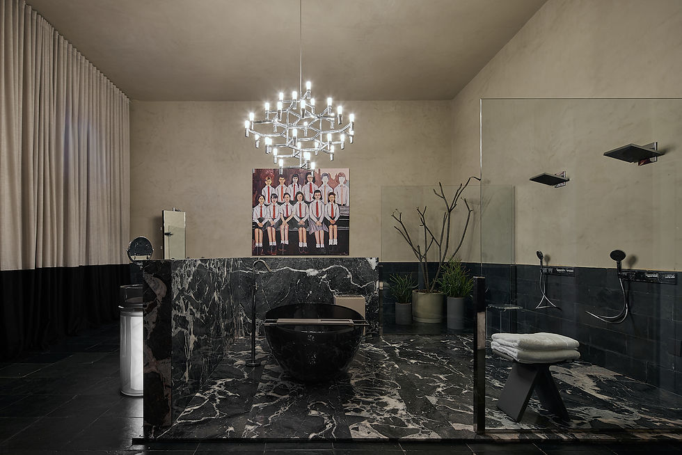 Neste projeto, transformamos o passado em poesia contemporânea. A antiga sala de aula, repleta de memórias e histórias, deu lugar a uma sala de banho que celebra o luxo atemporal com sensibilidade e sofisticação. Mantivemos a ardósia original do edifício como homenagem à história do espaço, agora ressignificada por uma atmosfera envolvente, interligada com a exuberante pedra Michelangelo — um mármore de veios marcantes e presença escultural. As louças e metais da Belíssimo Vallvé reforçam a linguagem refinada do projeto, enquanto a iluminação cênica valoriza as texturas e convida ao ritual do bem-estar. Nas paredes, obras de arte cuidadosamente selecionadas estabelecem um elo entre o ontem e o agora — remetendo ao antigo uso do espaço, resgatando sua essência com um olhar contemporâneo e poético. Este é um ambiente que une memória, design e contemplação: um espaço sensorial onde o tempo se dilui entre história e modernidade.